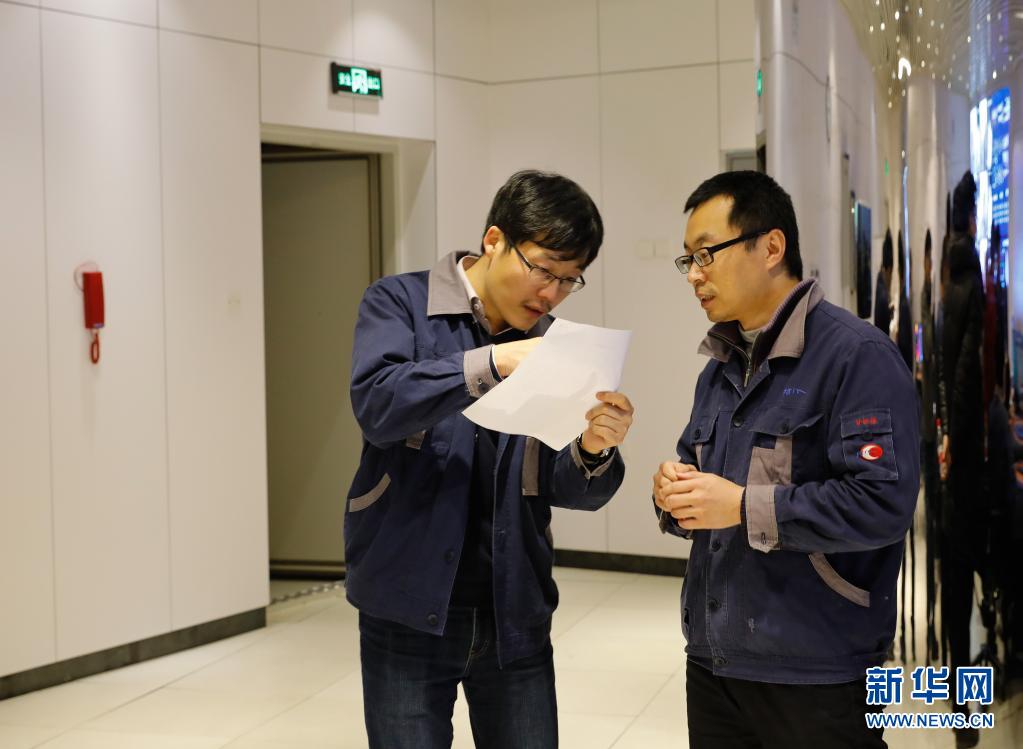 目前担任“中国天眼”运行和发展中心电子与电气工程部主任的甘恒谦(右)在总控室和同事讨论工艺测试方案(2019年1月27日摄)。