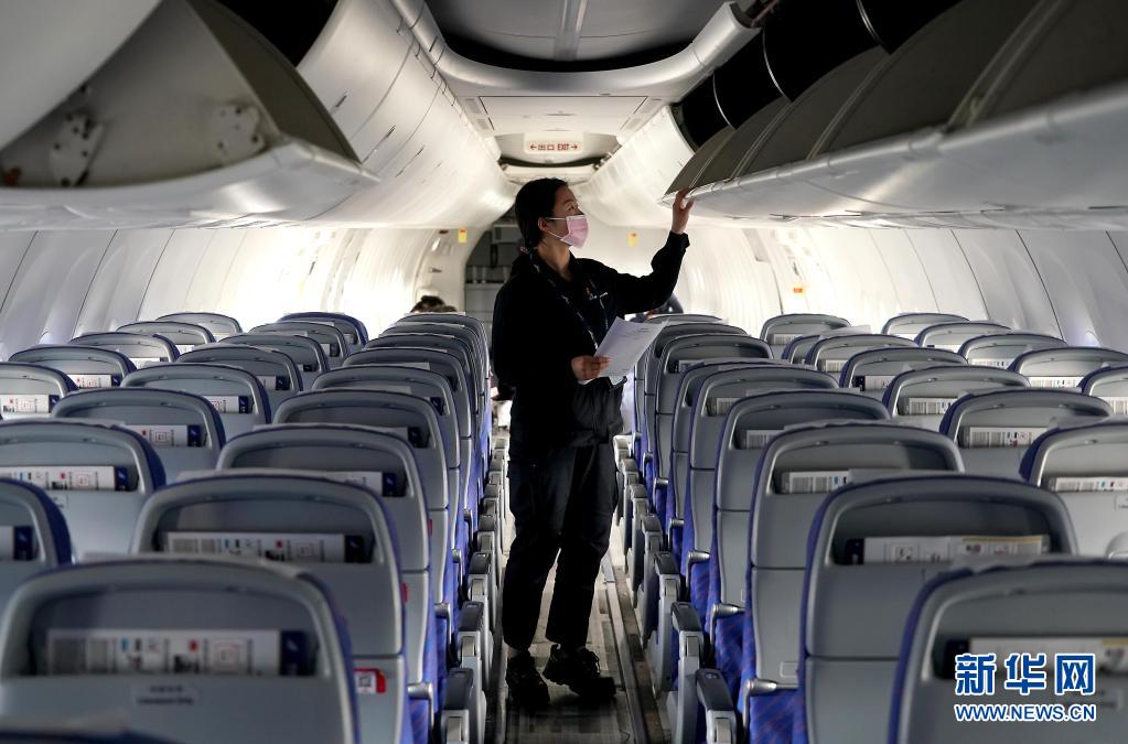 刘琪琦在客舱检查飞机行李架的完好性(4月30日摄)。