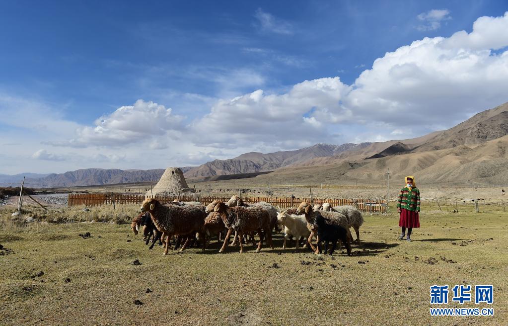 一名塔吉克族妇女在吉日尕勒文化遗址的亚尔特拱拜孜古驿站附近牧羊(5月3日摄)。