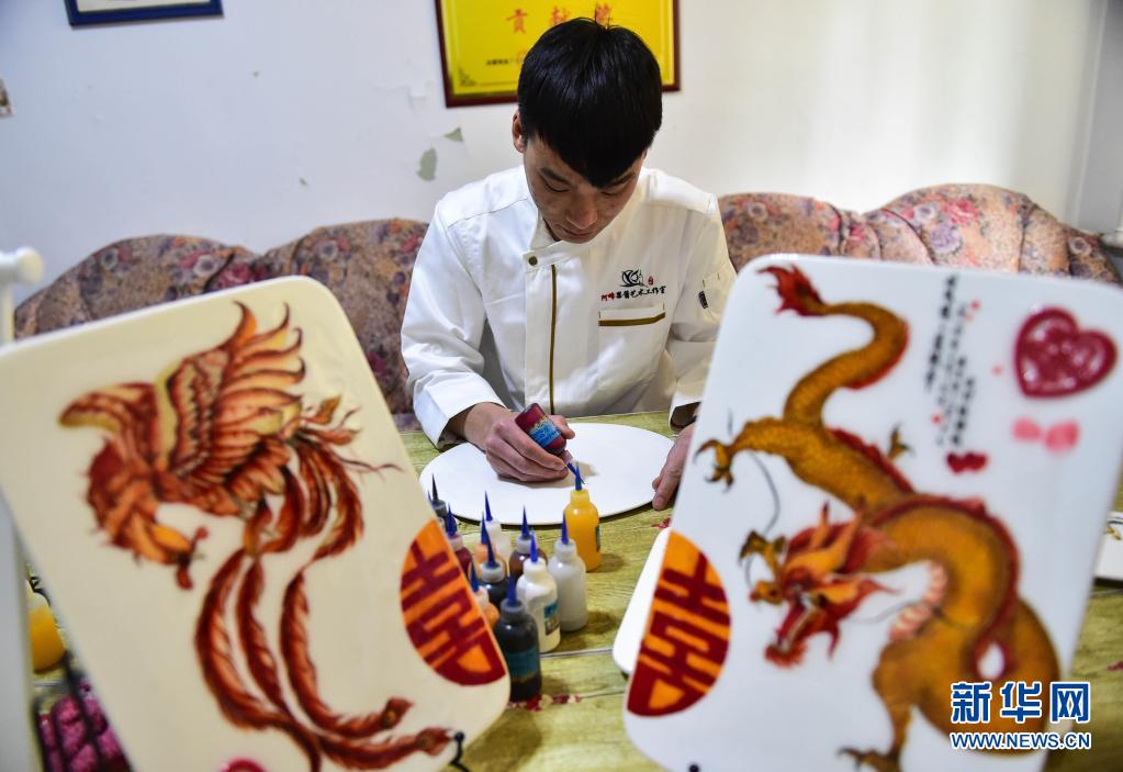 在阿峰果酱艺术工作室,刘旭峰在画果酱画(4月28日摄)。