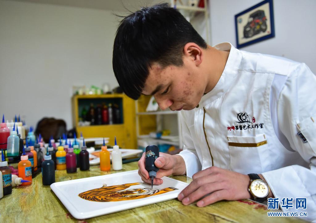 在阿峰果酱艺术工作室,刘旭峰在画果酱画(4月28日摄)。新华社记者 柴婷 摄