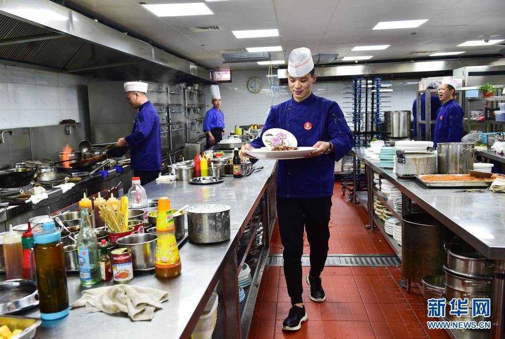 5月3日,在工作的酒店,刘旭峰准备为客人端上装饰着自已的果酱画的菜肴。新华社记者 柴婷 摄
