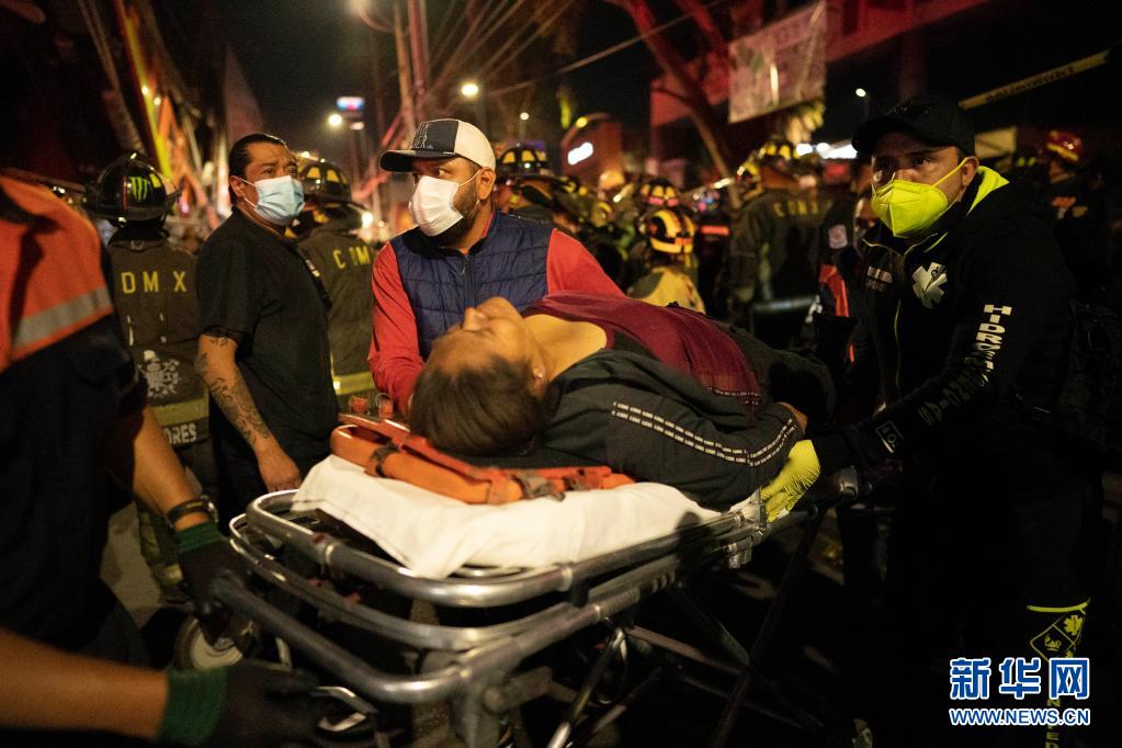 5月3日晚,救援人员在墨西哥首都墨西哥城的坍塌现场运送一名伤者。