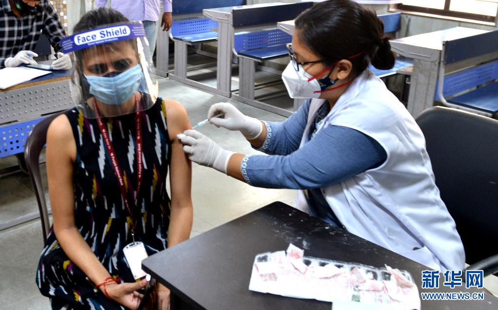 5月3日,医务人员在印度德里为一名女子接种新冠疫苗。