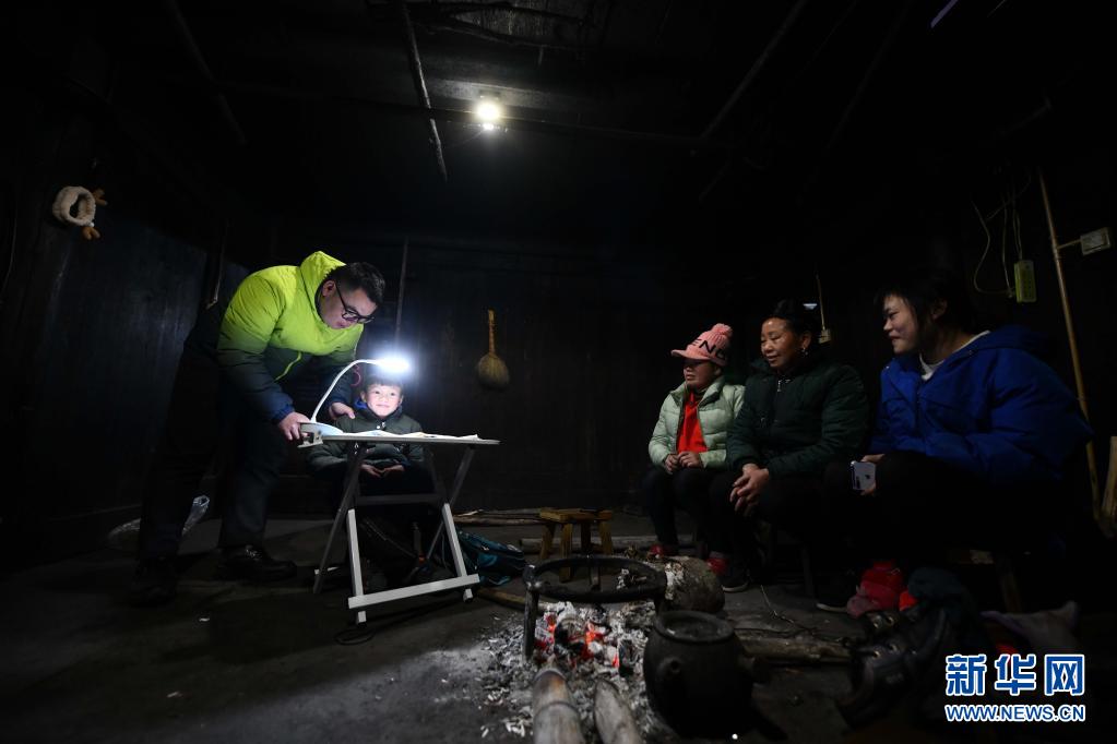 在乌英苗寨,郑昌昊(左一)给学生卜秀文送台灯(1月7日摄)。