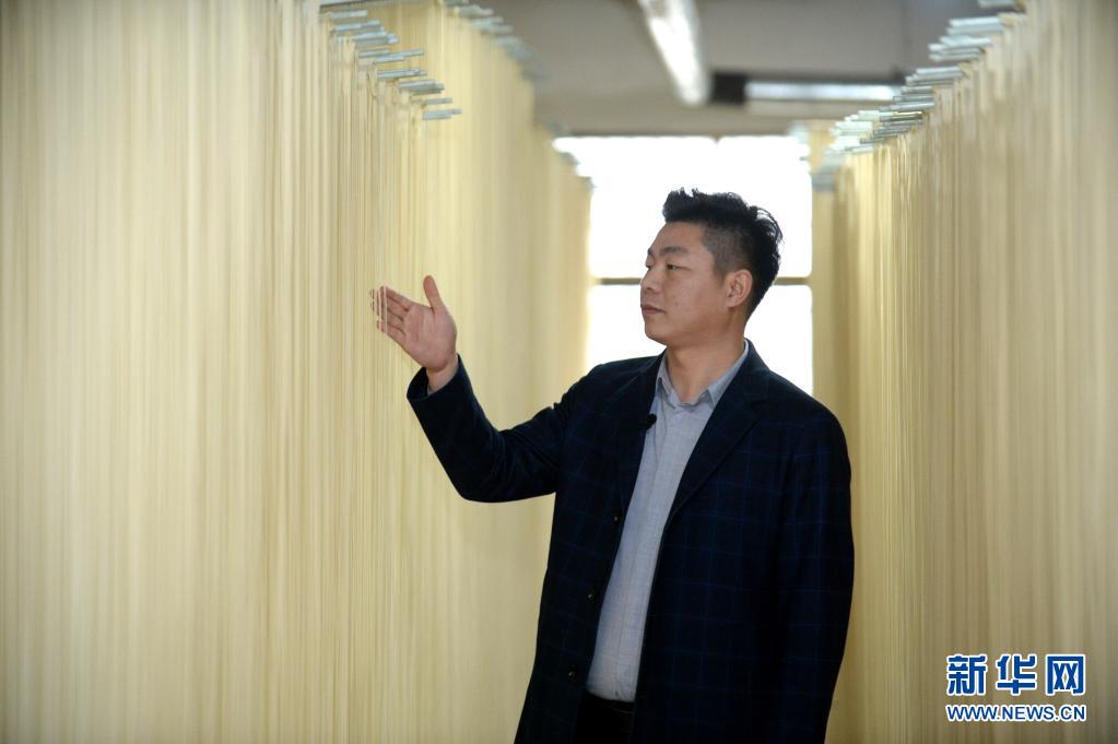 在河南省信阳市潢川县付店镇刘楼村,村党支部书记胡晓柱在查看一个空心贡面生产车间(3月18日摄)。