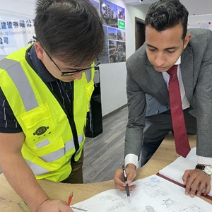 4月29日,在位于埃及开罗的中国化学工程第十六建设有限公司埃及分公司,埃及青年工程师穆罕默德·哈立德·法萨拉(右)与同事商讨业务。新华社发(陈然 摄)