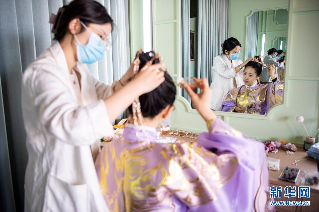 5月4日,在太原古县城的一家店铺内,游客化妆准备体验古风拍摄。