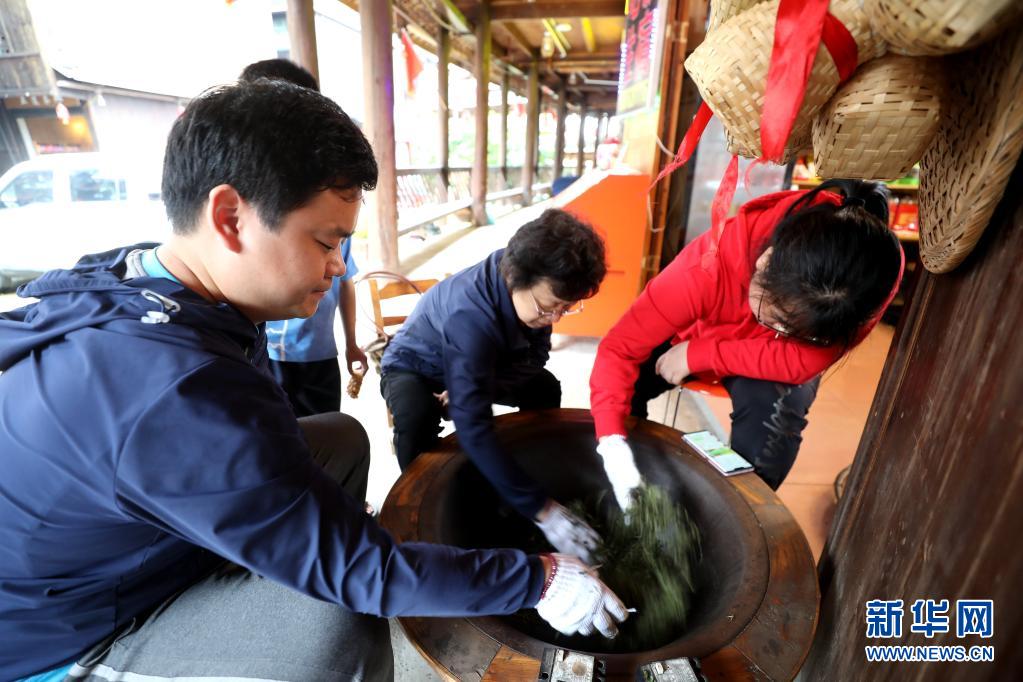 5月4日,在广西三江侗族自治县八江镇一茶园,游客在体验茶叶制作。