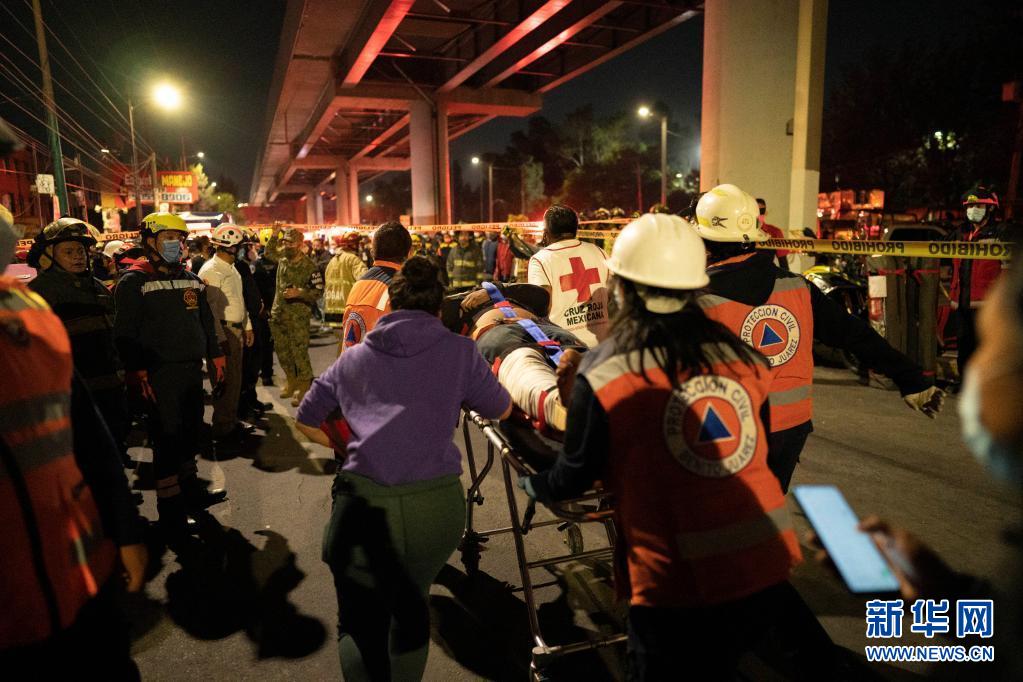 5月3日晚,救援人员在墨西哥首都墨西哥城的坍塌现场转移伤者。