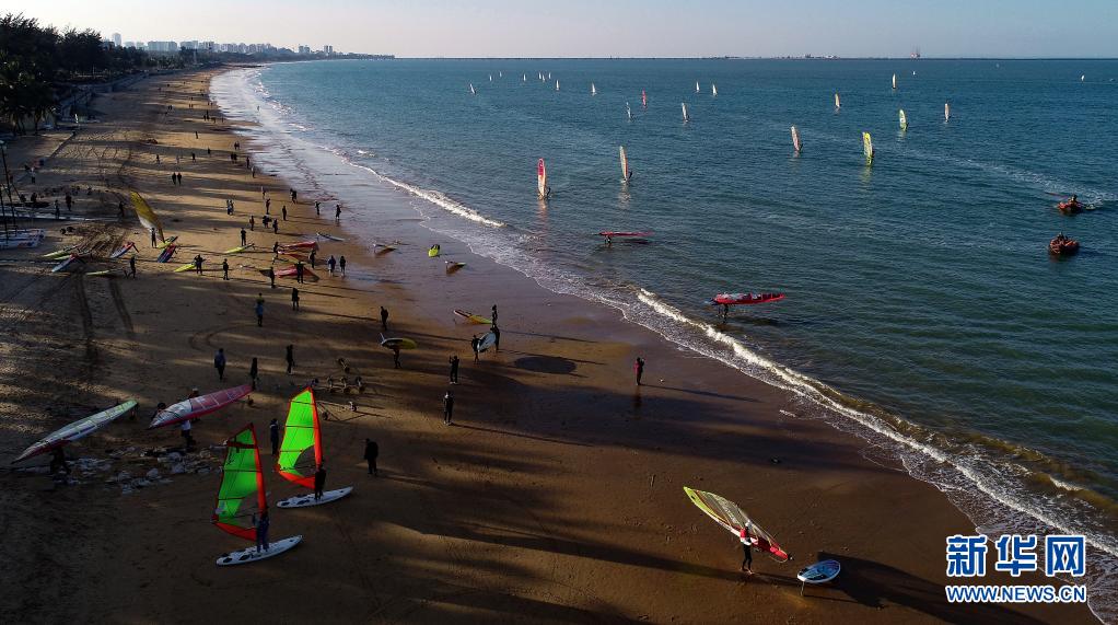 帆船帆板队选手在海口海滨冬训(1月12日摄,无人机照片)。
