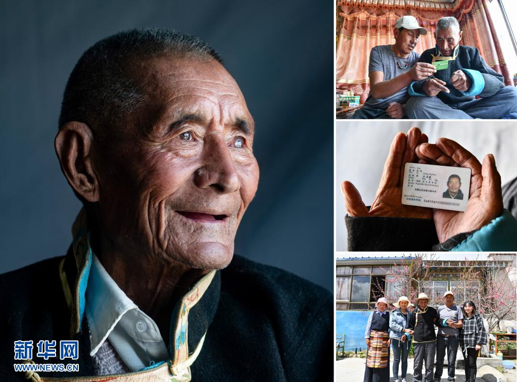 右上:拉布的儿子(左)在向老人介绍医保卡的情况(4月25日新华社记者晋美多吉摄)。