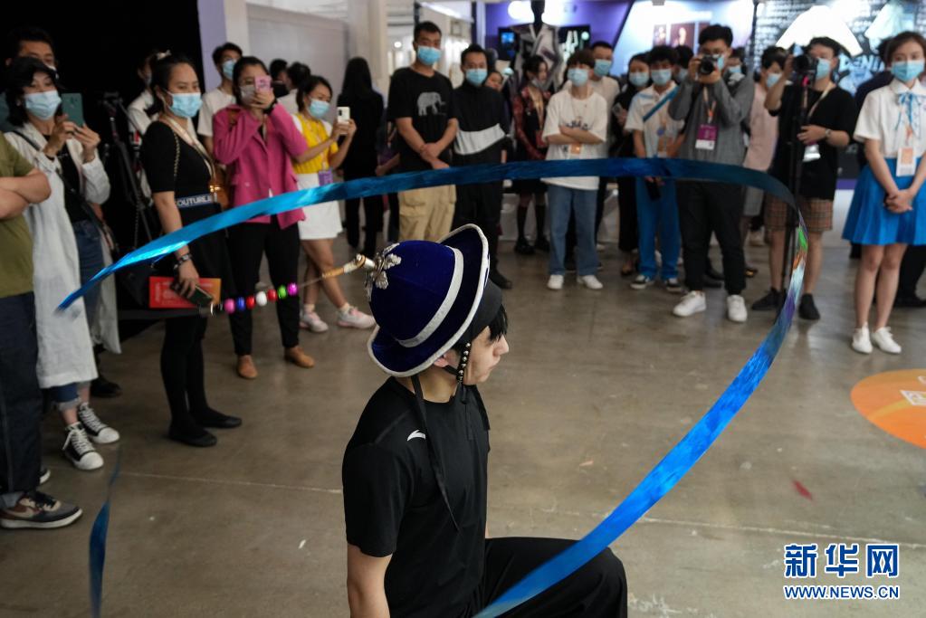 5月6日,在成都市东郊记忆国际艺术展览中心,北京舞蹈学院学生魏子恒在民俗文化体验工作坊展台展示朝鲜族象帽舞。