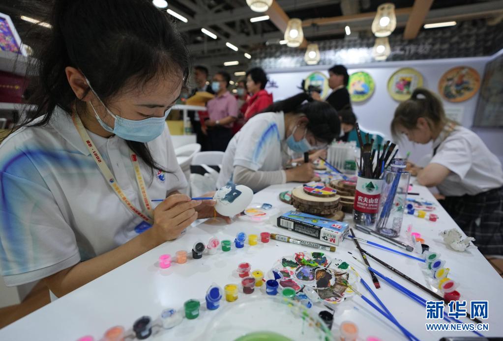 5月6日,在成都市东郊记忆国际艺术展览中心,成都理工大学学生刘朝霞在惠州学院龙门农民画工作坊展台体验创作龙门农民画。