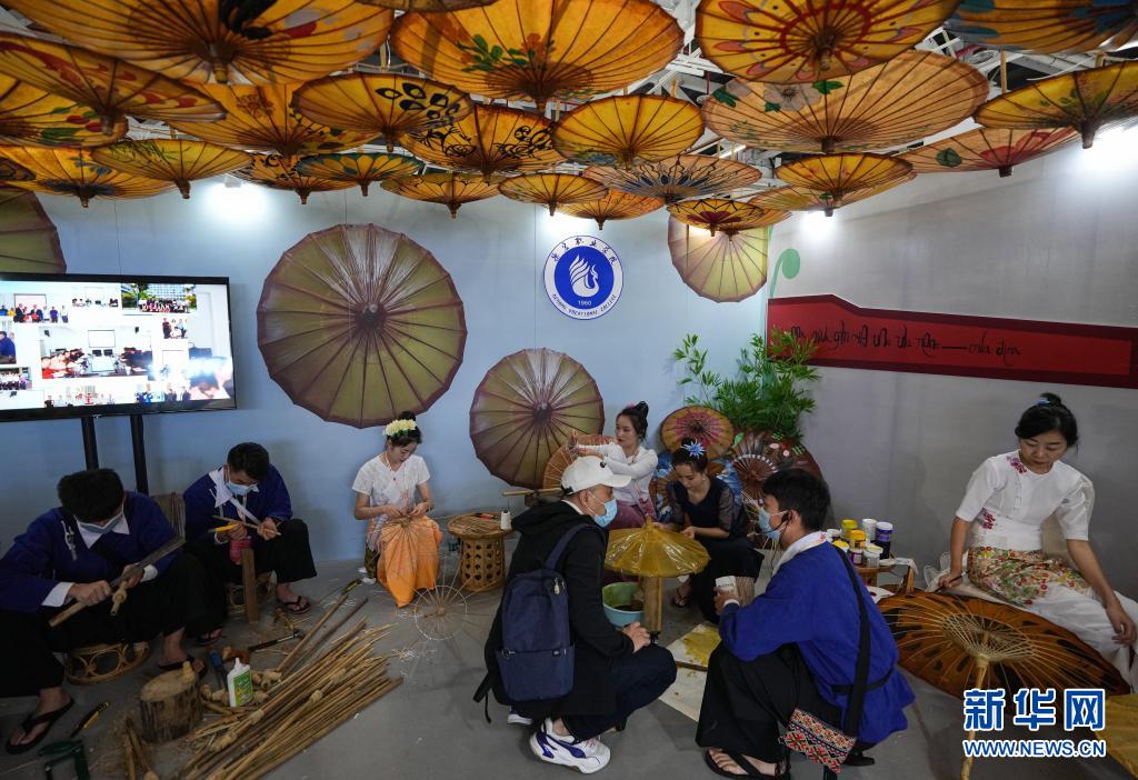 5月6日,在成都市东郊记忆国际艺术展览中心,师生在德宏职业学院大学生艺术实践工作坊展台展演傣族油纸伞制作工艺。