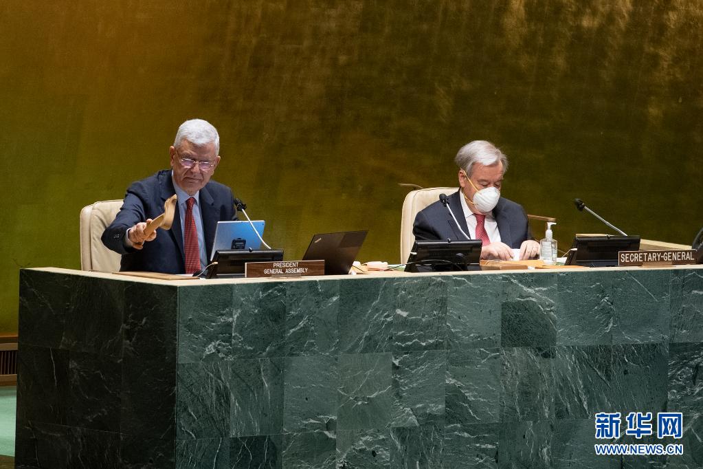 5月5日,在位于纽约的联合国总部,联大主席博兹克尔(左)与联合国秘书长古特雷斯出席联大纪念多边主义与和平外交国际日互动对话会。