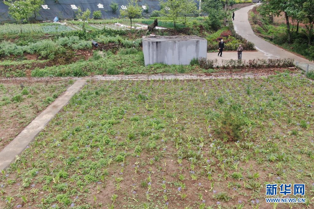 种上了没有净化功效的鲜花的霍村人工湿地(生态植物塘)和塔式生态滤池(4月25日摄,无人机照片)。