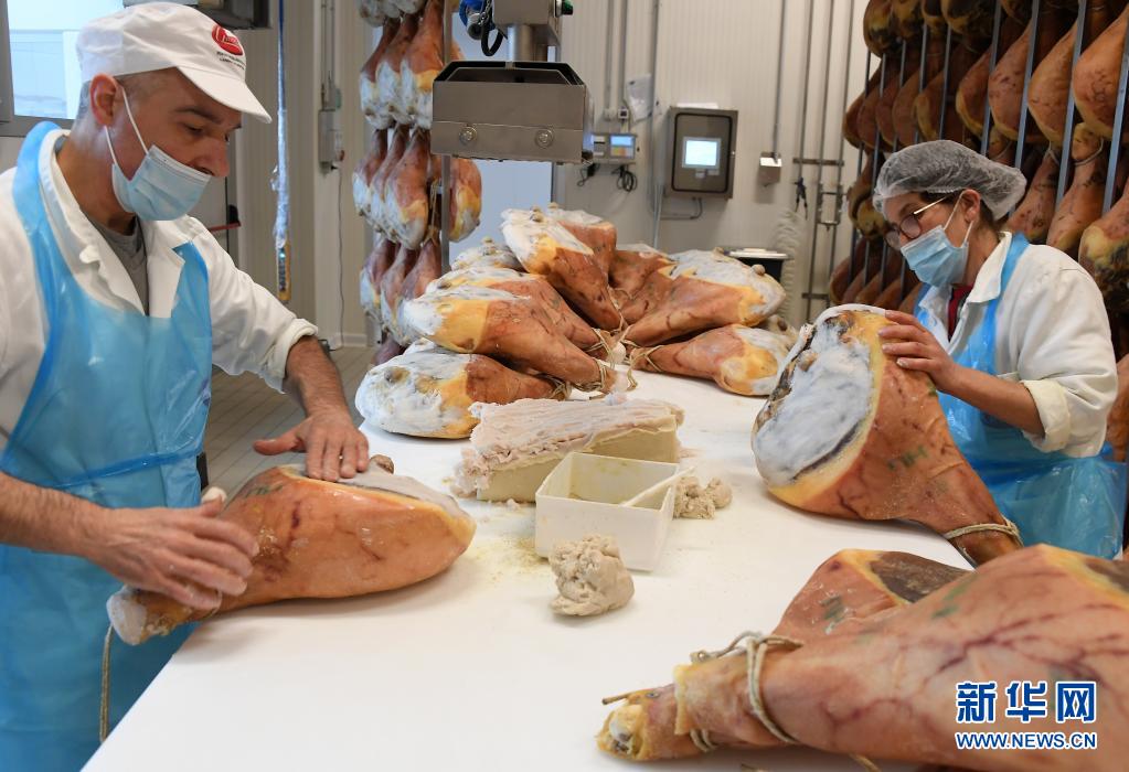 4月13日,在意大利帕尔玛的一家公司工厂,工人们将猪油和盐的混合物涂抹在腌制并风干了一段时间的猪腿上。