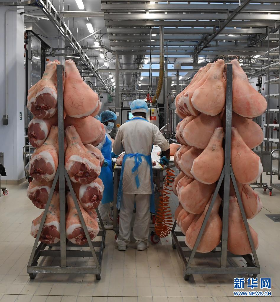 4月13日,在意大利帕尔玛的一家公司工厂,工人们在车间修整即将进行腌制的猪腿。