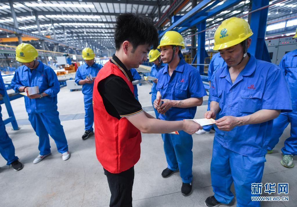 5月7日,来自“织里知礼·青年宣讲团”的党员志愿者走进栋梁新材有限公司的车间,给参加宣讲活动的企业员工发放相关资料。