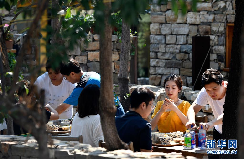 游人在天津市蓟州区西井峪村一座农家院内休憩(2020年8月21日摄)。