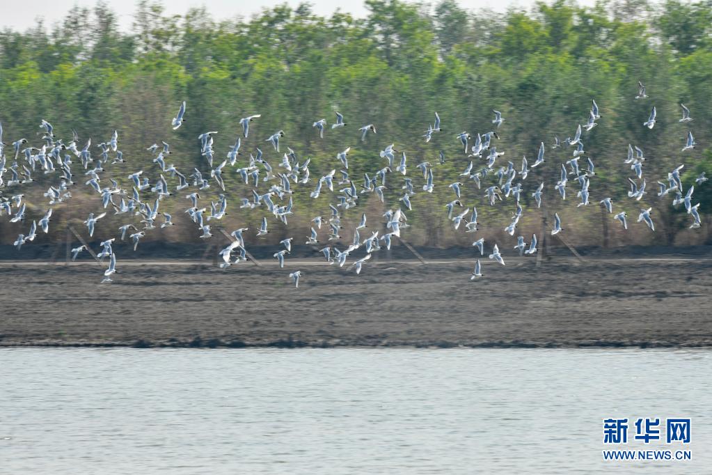 水鸟在天津市西青区西西海生态湿地上空飞翔(4月27日摄)。