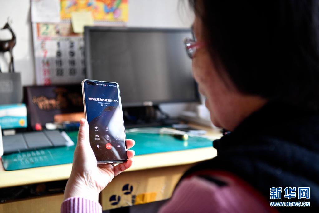 家住天津市河西区桃园街道的独居老人在体验居家养老服务的智能外呼系统(2月9日摄)。