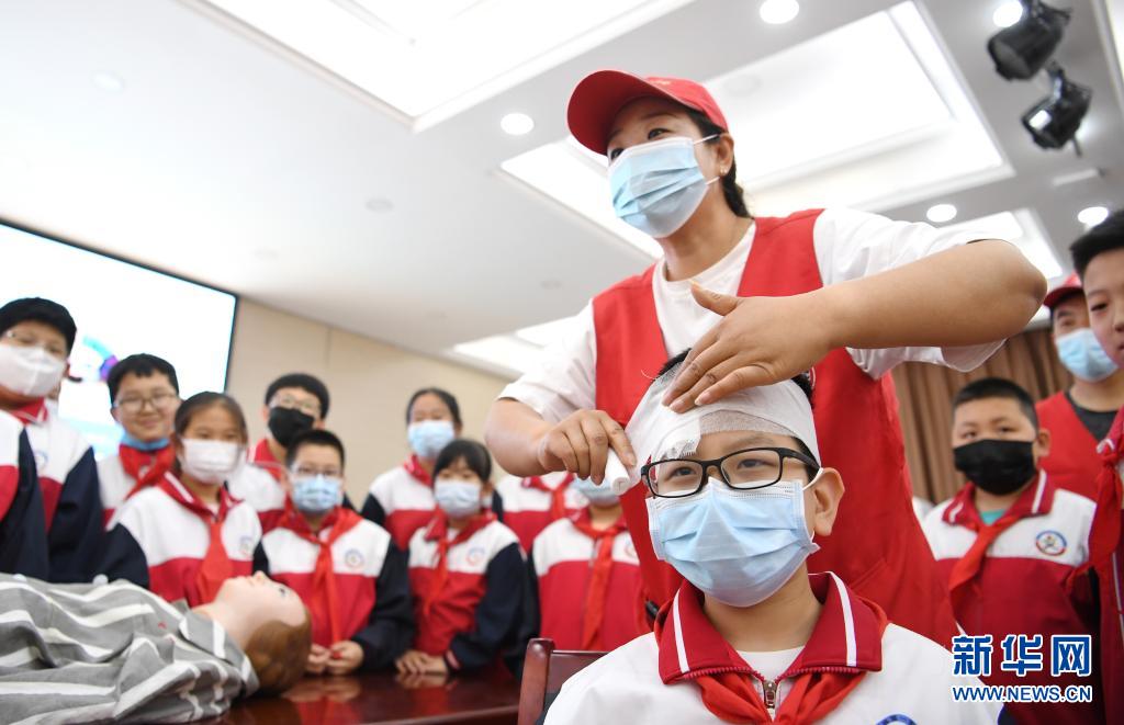 5月7日,安平县红十字会志愿者在第一实验小学向学生讲解急救包扎知识。新华社记者 朱旭东 摄