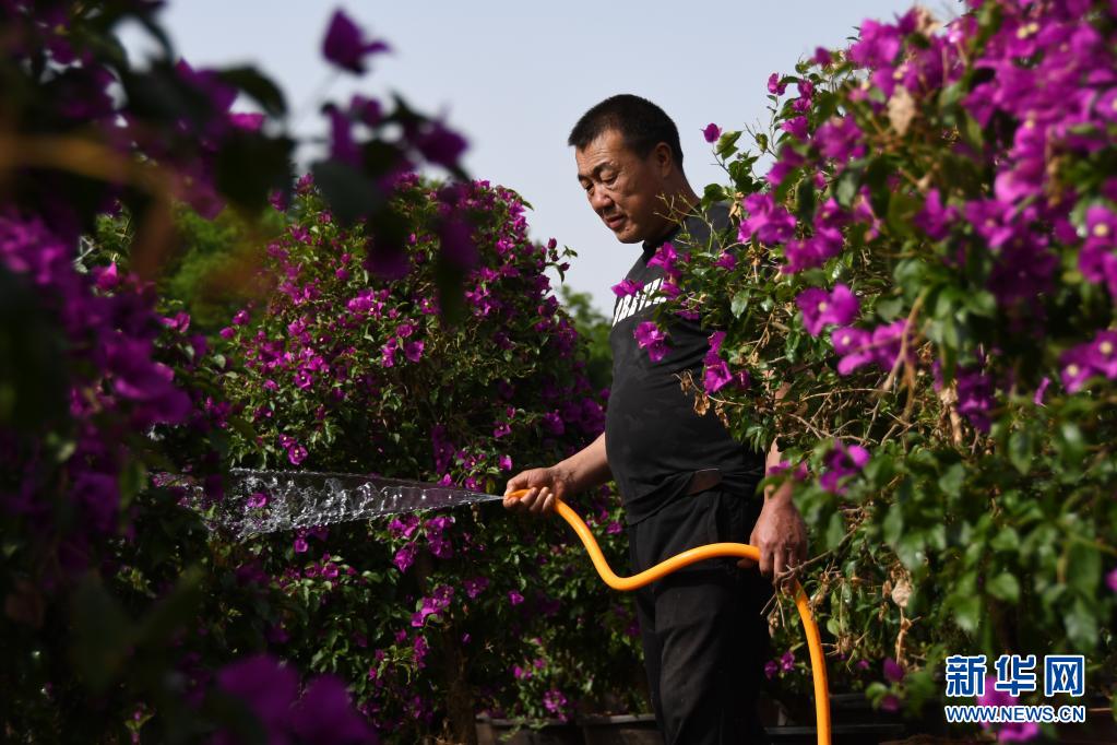 5月7日,在秦北世纪花园中心,一名园艺工人在为三角梅浇水。