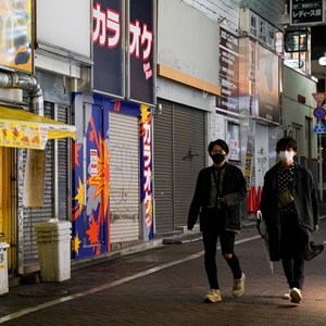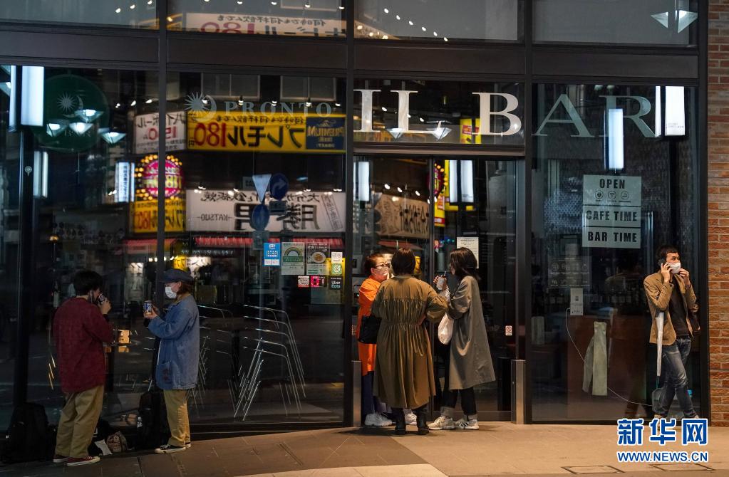 5月7日,人们在日本东京一间提前结束营业的酒吧前停留。