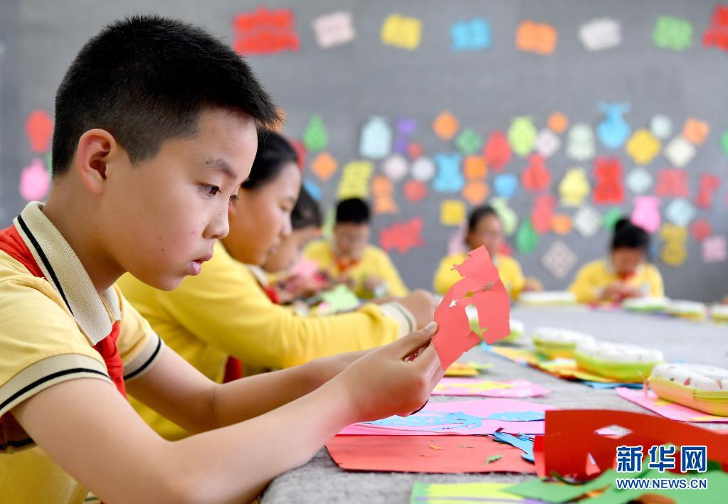 延安市新区第一小学剪纸社团的学生在练习剪纸(5月7日摄)。