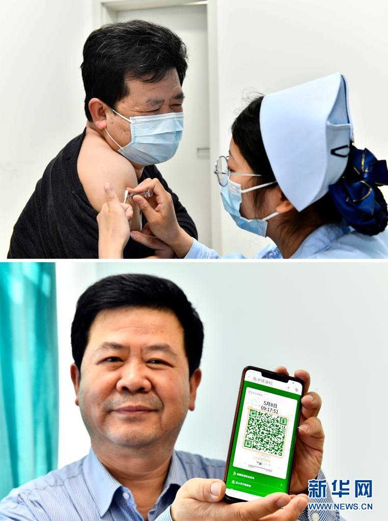 拼版照片上图:在山东省立第三医院,援鄂医疗队队员、大内科主任王言森接种新冠疫苗(1月6日摄);下图:在山东省立第三医院,王言森展示自己的金色健康码(5月8日摄)。