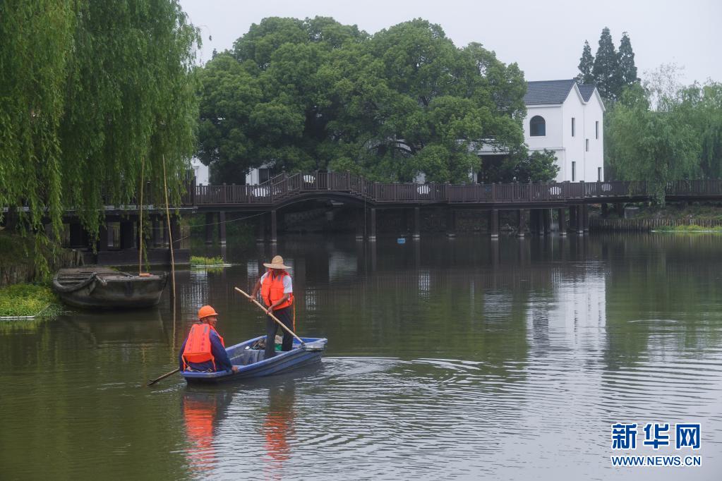 5月8日,在浙江省湖州市吴兴区东林镇泉益村,保洁人员在进行河道日常巡查清理。