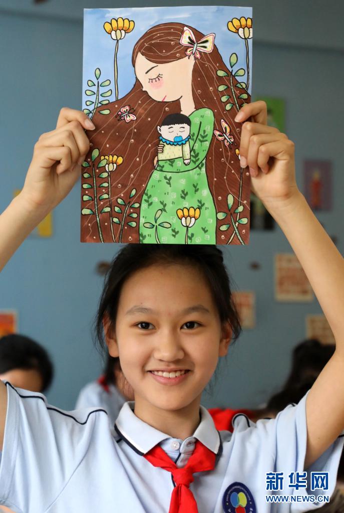 5月8日,江苏省苏州市三元实验小学校学生展示自己绘制的妈妈形象。新华社发(杭兴微 摄)