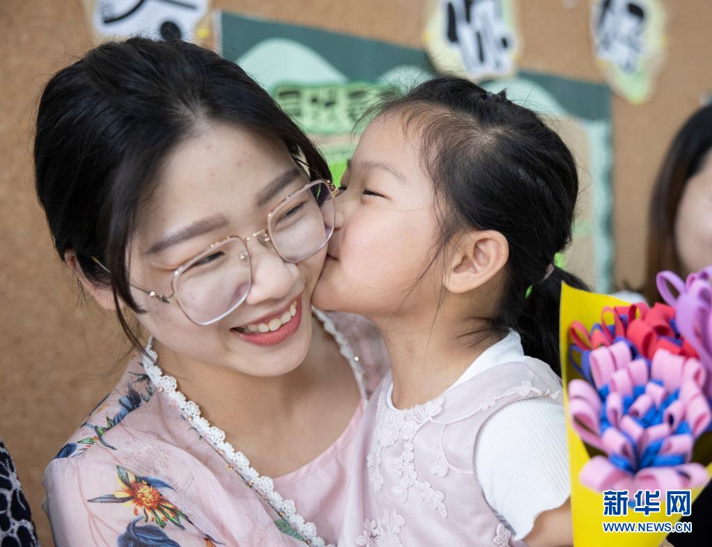 5月8日,浙江省诸暨市暨北幼儿园的小朋友亲吻妈妈。新华社发(郭斌 摄)