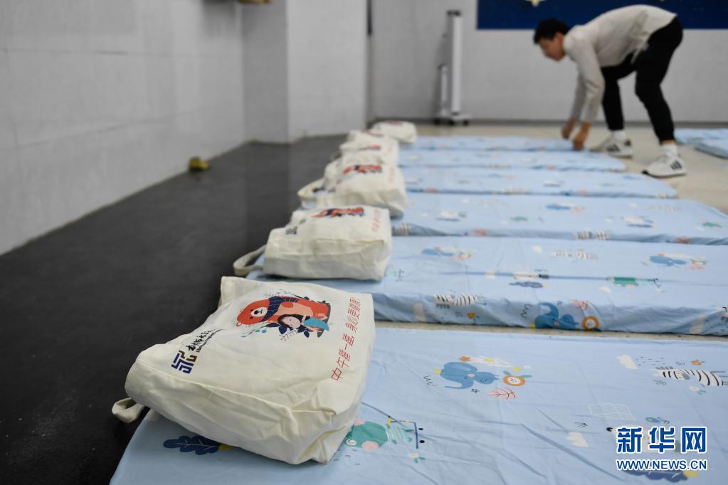 5月8日,杭州市永正实验学校的老师在午睡室内整理床铺。