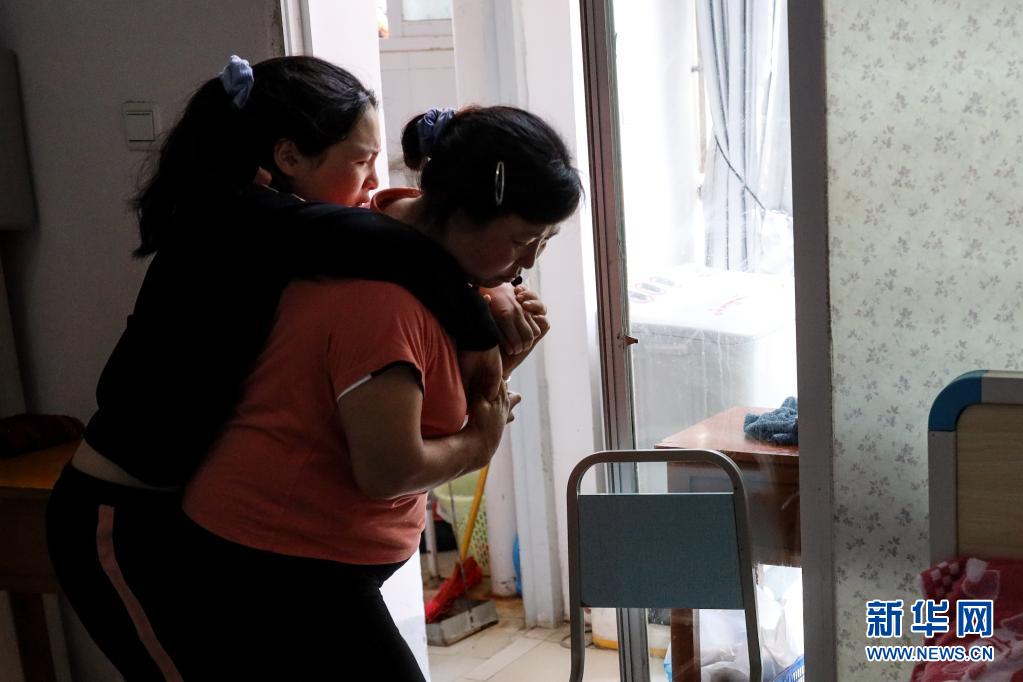 5月8日,母亲侯汝彩(右)背着女儿马小婷上床休息。