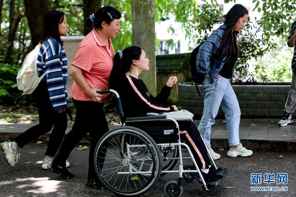 5月8日,母亲侯汝彩推着女儿马小婷在校园内散步。