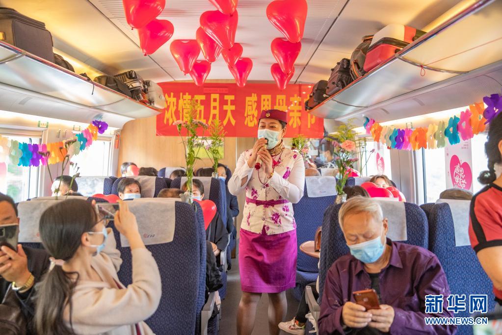 在母亲节来临之际,中国铁路成都局集团有限公司重庆客运段组织青年职工在万州北至重庆北的C6407次列车上,开展“浓情五月天,感恩母亲节”主题活动。活动中,青年职工们通过邀请旅客现场送鲜花、写祝福卡片、视频送祝福等方式向广大母亲送上节日的祝福。