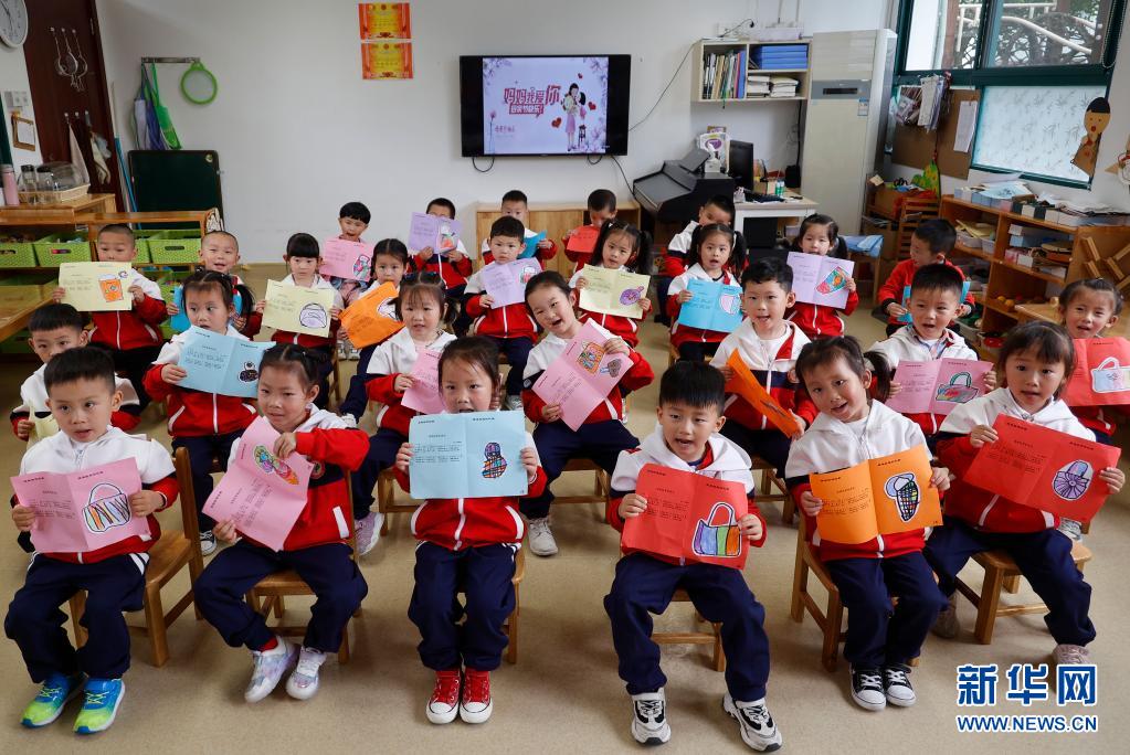 当日,浙南山区丽水市景宁畲族自治县浮丘幼儿园小朋友在巧手课堂上制作母亲节礼物,并写上美好的祝福语句,祝妈妈节日快乐。