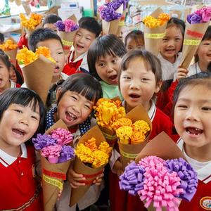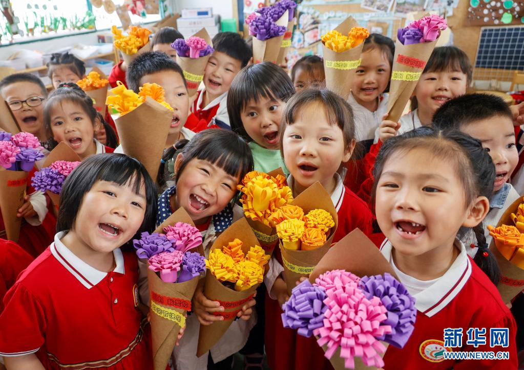 5月8日,景宁畲族自治县浮丘幼儿园小朋友展示手工制作的“康乃馨”花束。