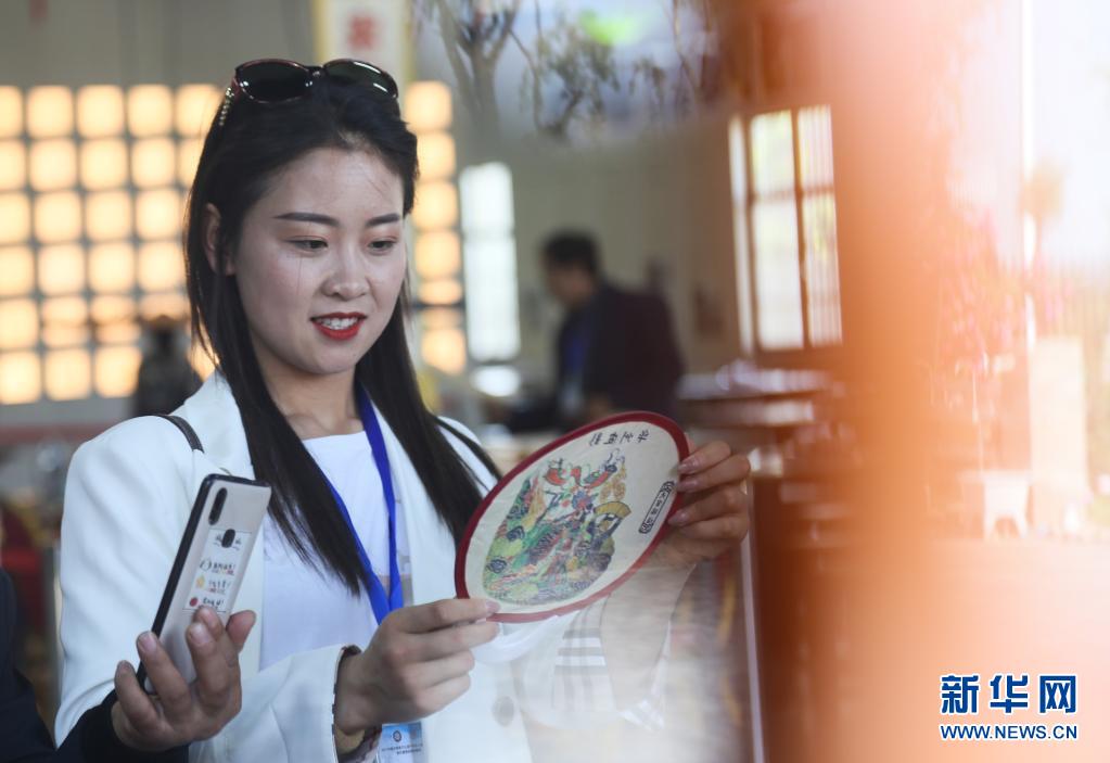 5月8日,游客在陕西省渭南市华州区少华山国际皮影博览园挑选皮影文创产品。