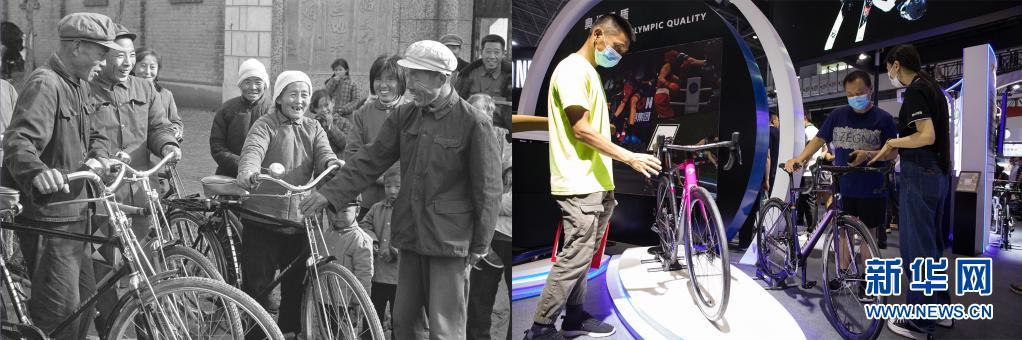 这是一张拼版照片:左图为1982年,山东省宁津县杜集公社李镇大队社员高高兴兴地买回新自行车(新华社记者李锦 摄);右图为2021年5月8日,在海南举行的首届中国国际消费品博览会旅居生活/消费服务展区,观众在体验时尚运动自行车(新华社记者金立旺 摄)。