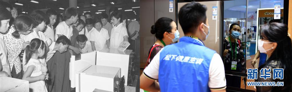 这是一张拼版照片:左图为1980年,顾客在北京西单商场选购日本进口的电冰箱(新华社记者卢琰源 摄);右图为2021年5月7日,观众在海南举行的首届中国国际消费品博览会旅居生活/消费服务展区了解电冰箱(新华社记者郭程 摄)。新华社发