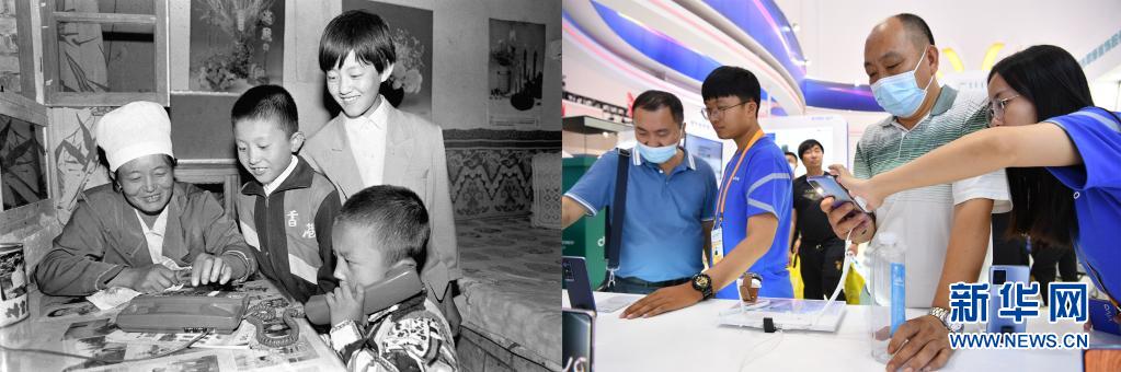 这是一张拼版照片:左图为1996年,在宁夏西吉县兴隆镇,靠加工牛百叶走上了富裕路的马雪玲(左一)和子女一起打电话向外地做生意的丈夫问好(新华社记者刘泉龙 摄);右图为2021年5月8日,观众在海南举行的首届中国国际消费品博览会广东展区体验新款手机(新华社记者郭程 摄)。新华社发