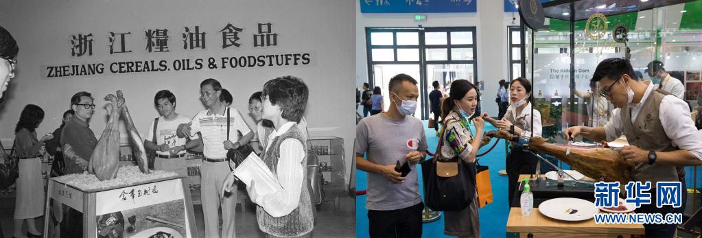 这是一张拼版照片:左图为1983年,港澳记者在了解金华火腿(新华社记者吴元柳 摄);右图为2021年5月8日,在海南举行的首届中国国际消费品博览会高端食品保健品展区,观展者在品尝西班牙火腿(新华社记者金立旺 摄)。新华社发