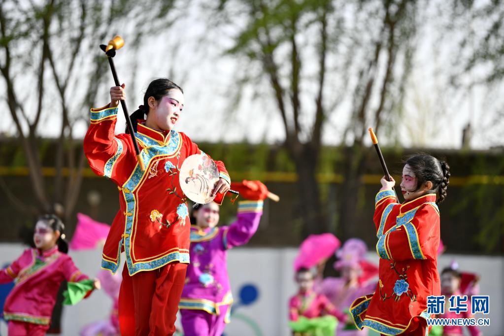 5月8日,河北省滦州市小闫营小学学生在排练地秧歌。