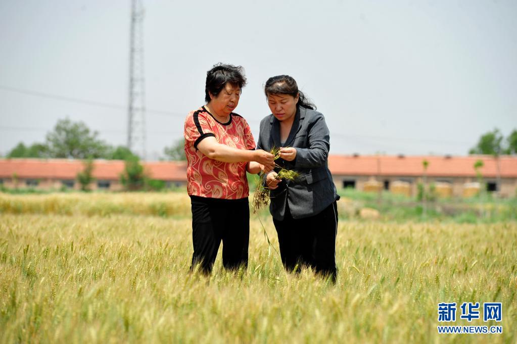 从国家信访局来到河北省海兴县苏基镇张常丰村任驻村第一书记的张巍婷(右)在麦田内查看小麦生长情况(2020年6月2日摄)。新华社记者 牟宇 摄