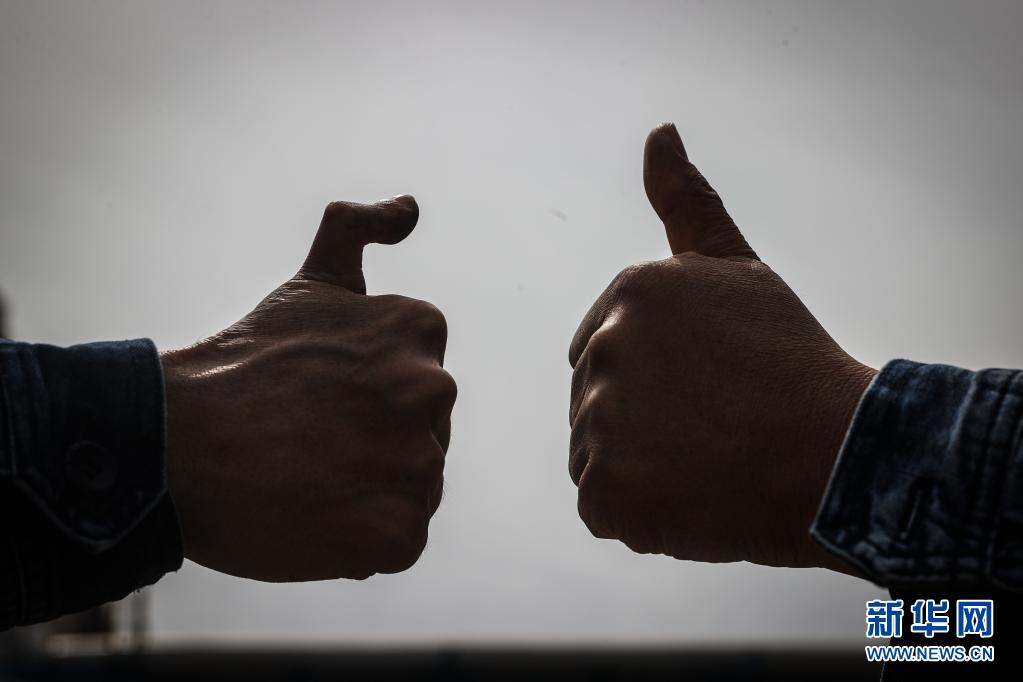 4月30日,王尚典(左)与同事一起做出“赞”的手势。