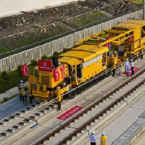这是5月8日在张吉怀铁路施工现场拍摄的长钢轨智能滚筒回收车。新华社发
